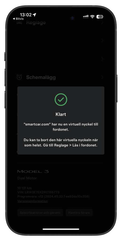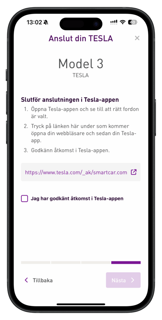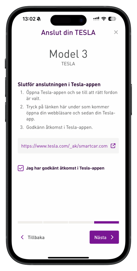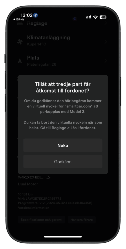 Genom att trycka på länken ovan öppnas Tesla-appen till följande skärm och här behöver användaren trycka på “Godkänn”: