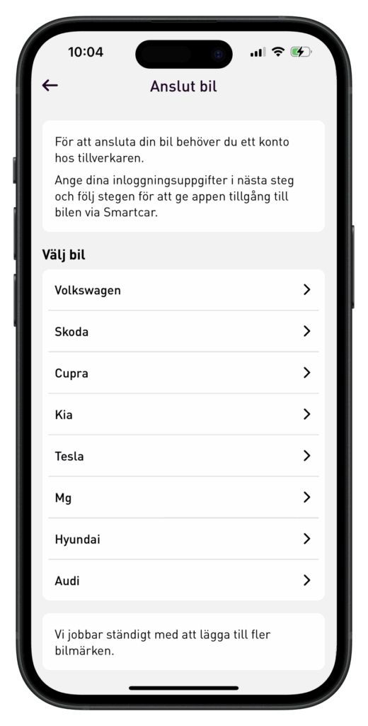 På nästa steg, välj tillverkare. För alla bilar förutom Tesla ser anslutningsprocessen likadan ut. Tesla beskrivs längre ner.