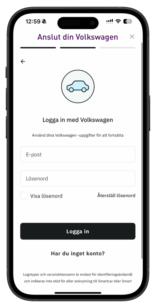 Detta öppnar Smartcars webbportal. Här behöver användaren logga in med användaruppgifter till tillverkarens app: