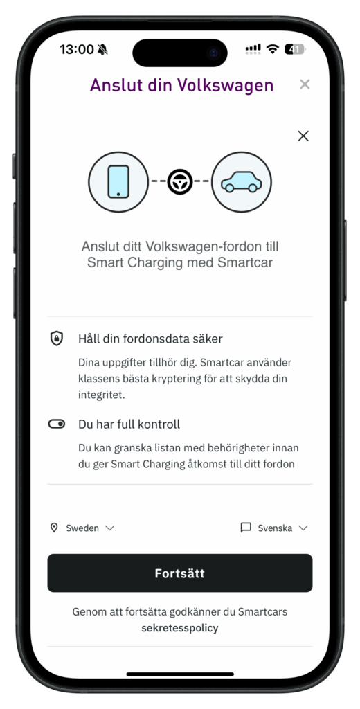 Efter att ha loggat in ska anvädaren följa stegen i Smartcars portal och slutligen trycka på Fortsätt: